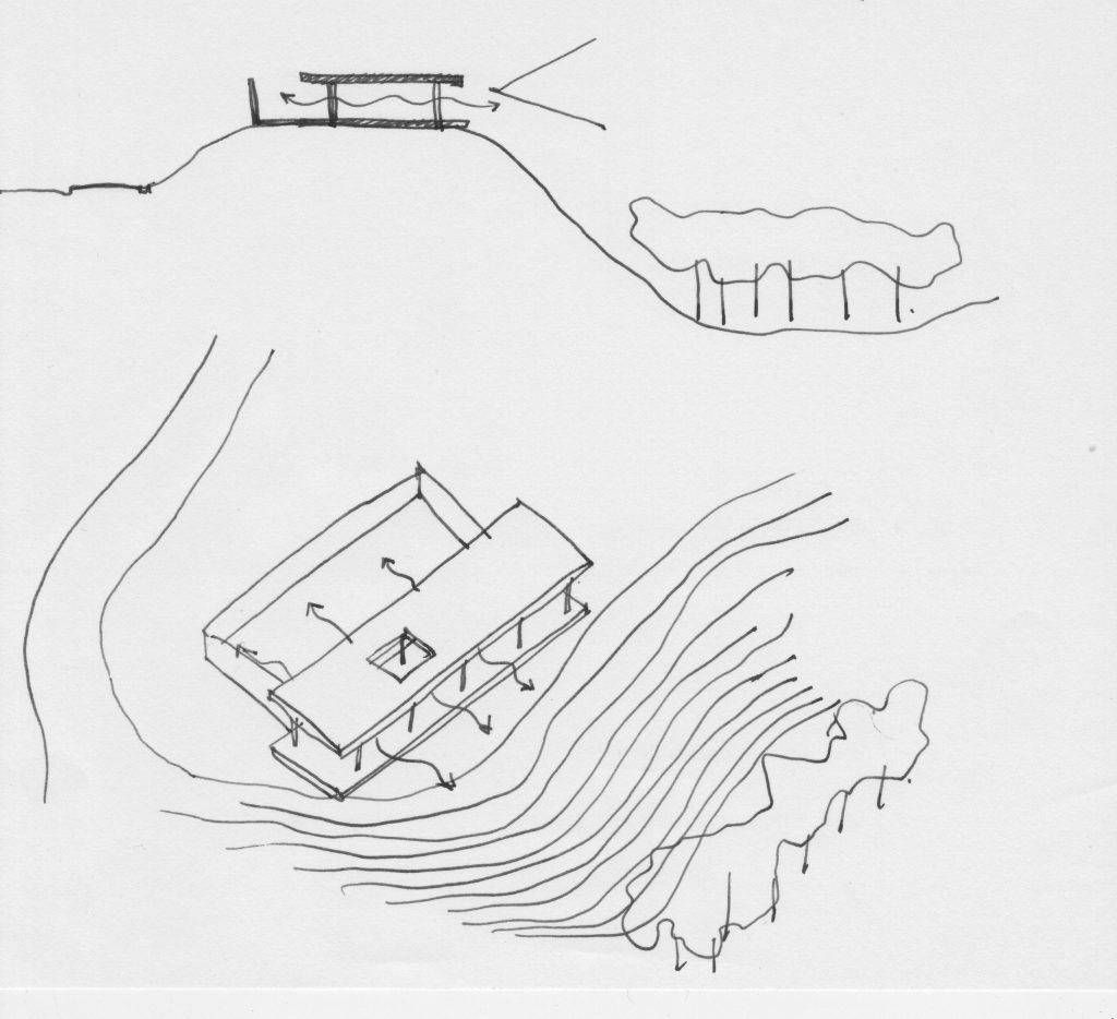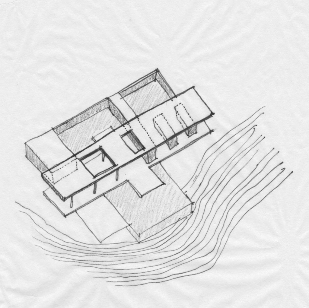 La propuesta se construye a partir de dos elementos fundamentales de la arquitectura: la cubierta y el patio. Una gran cubierta horizontal organiza el proyecto, protege del sol y la lluvia, y enmarca las visuales lejanas hacia las montañas. Bajo ella, la casa se compone como una secuencia de llenos y vacíos que alternan relaciones cercanas y lejanas: patios íntimos y aperturas amplias hacia el paisaje.