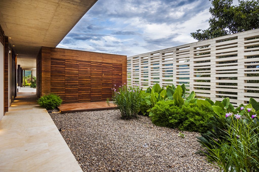 La materialidad refuerza la claridad conceptual del proyecto. El concreto ocre fundido en sitio, la madera de teca y la piedra muñeca construyen una atmósfera cálida y tectónica. La lógica modular —expresada en formaletas, paneles y prefabricados— unifica estructura y detalle. Los sistemas de paneles de madera permiten abrir o cerrar completamente la vivienda, respondiendo a la condición de uso intermitente.