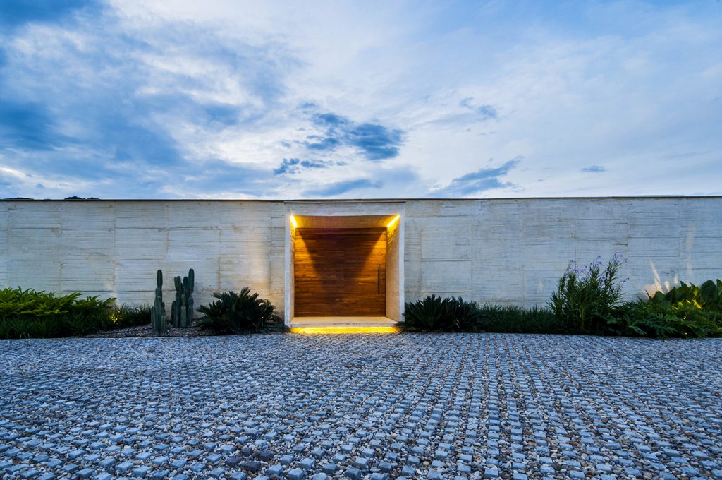 El acceso, intencionalmente contenido y angosto, incrementa la expectativa antes de revelar el interior. Al cruzar el umbral, el espacio se expande a través de un patio que enmarca la vista abierta sobre el valle. La plataforma social parece flotar entre el espejo de agua y la piscina, reforzando la presencia de los elementos naturales como protagonistas de la experiencia.