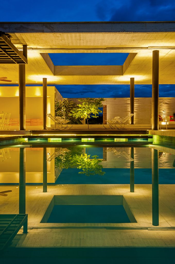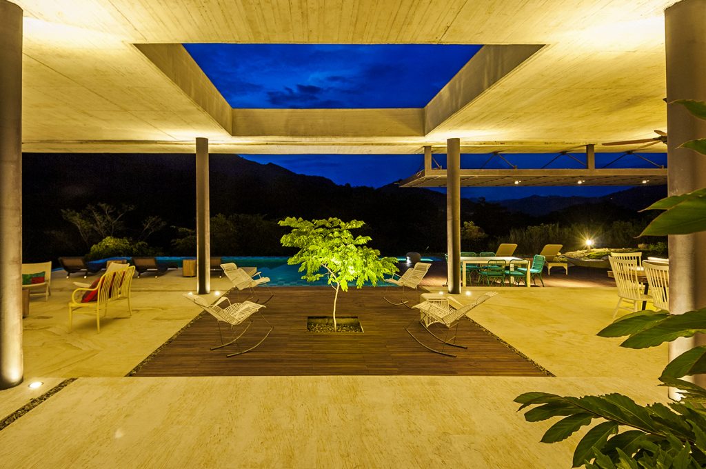 El área social se concibe como un único espacio continuo, abierto por un lado hacia las montañas y por el otro hacia el patio de acceso. Un segundo patio —un vacío en la cubierta— marca el cruce de los ejes principales (acceso–piscina y cocina–habitaciones) y actúa como centro neurálgico de la casa. Hacia un costado, la cocina y los servicios se insertan como un volumen más bajo; en el ala opuesta, las habitaciones se orientan al paisaje y se articulan mediante un tercer patio con cerramientos permeables en prefabricados de concreto y vegetación nativa.