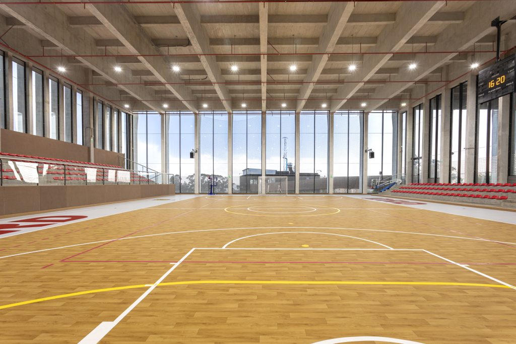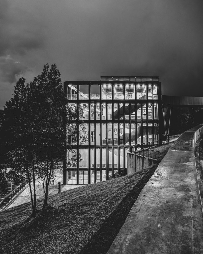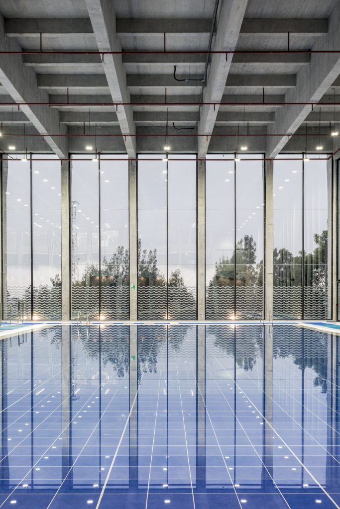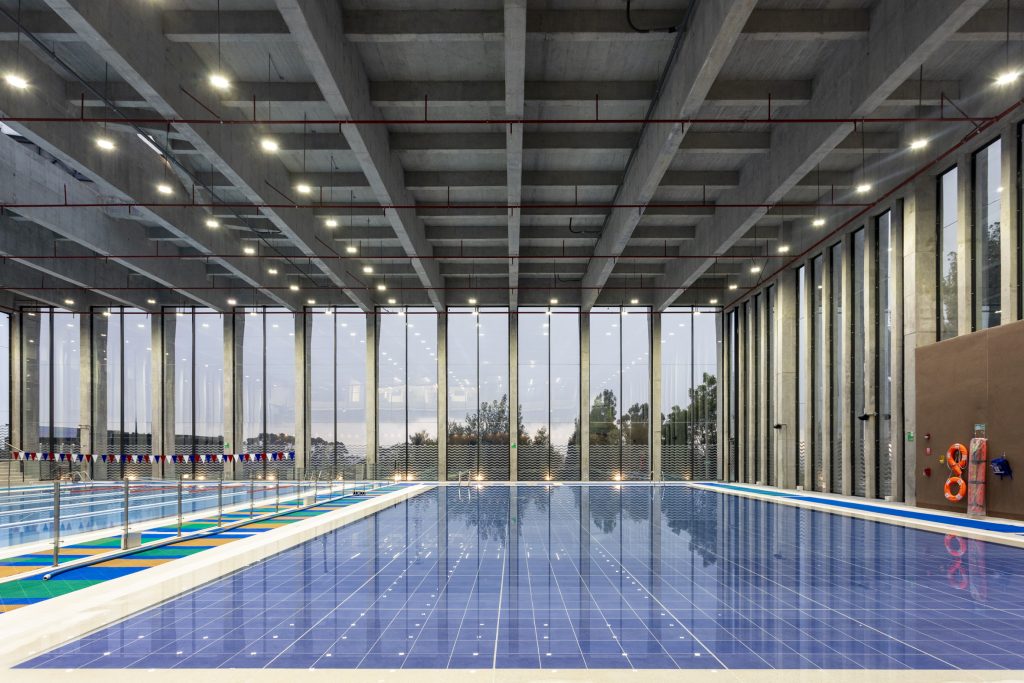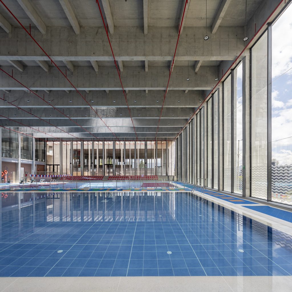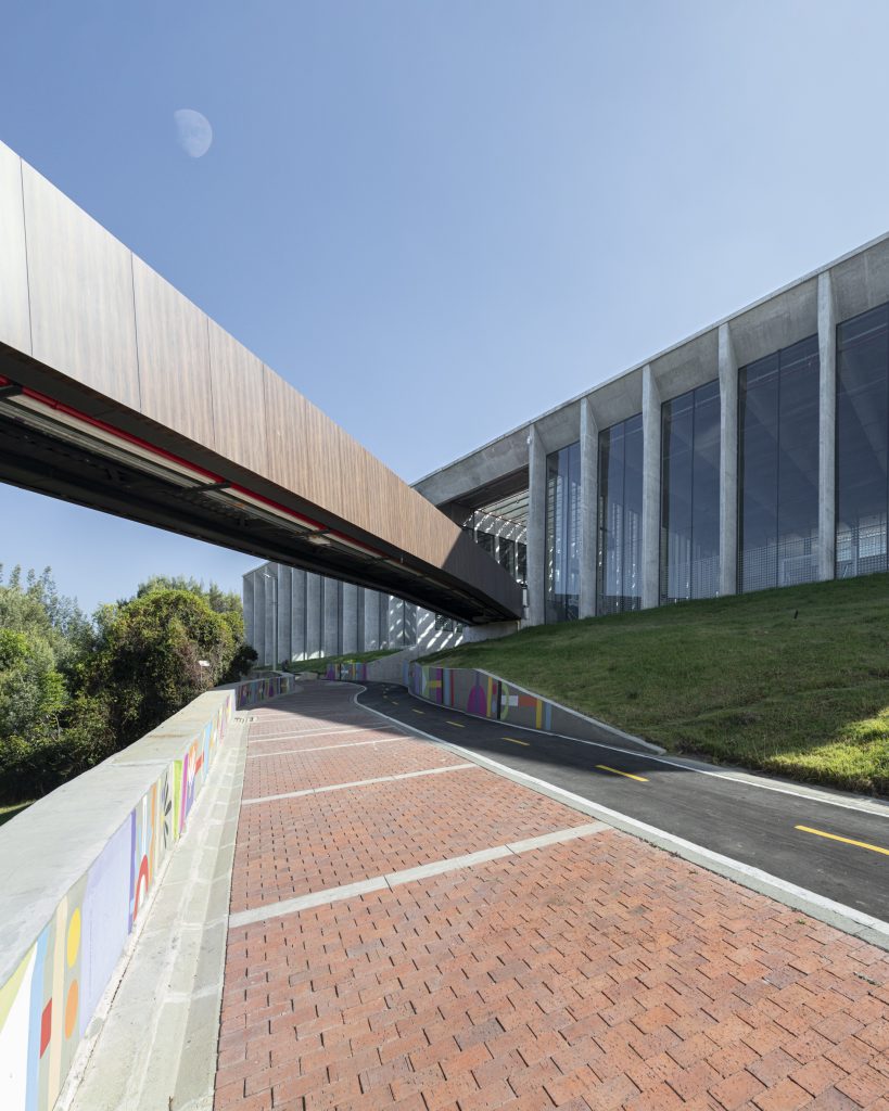 La propuesta responde a la condición particular del lote —dividido por una franja técnica que alberga una conducción principal de agua— organizando el programa deportivo en la parte alta, vinculado al parque, y el cultural en el borde urbano inferior. Ambos volúmenes se conectan mediante un puente que enfatiza esta transición y consolida el edificio como punto de encuentro, capaz de funcionar incluso cuando el parque permanece cerrado.