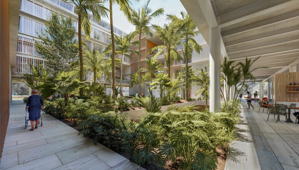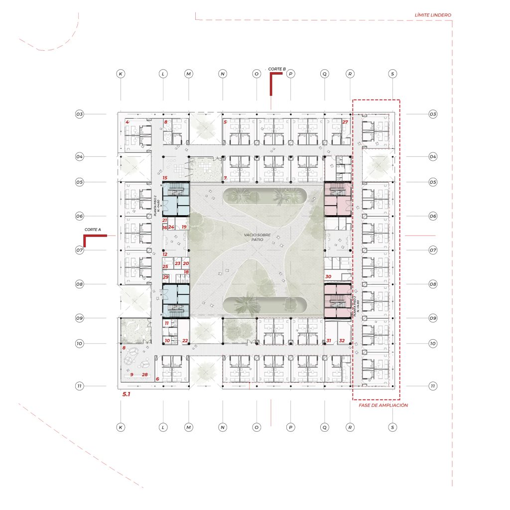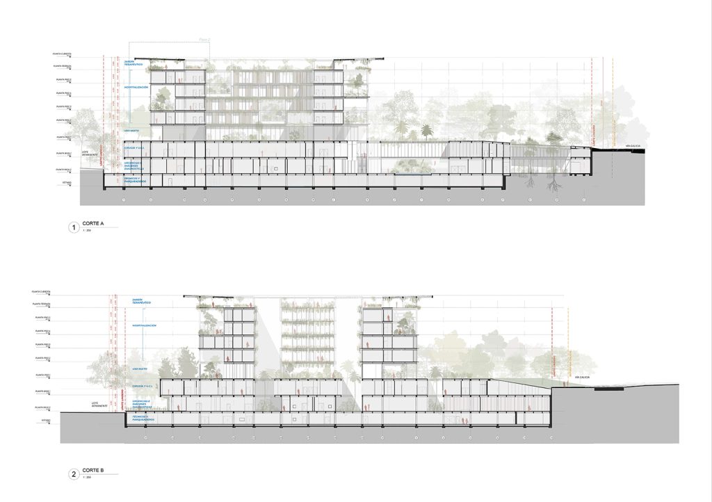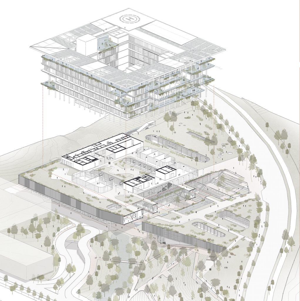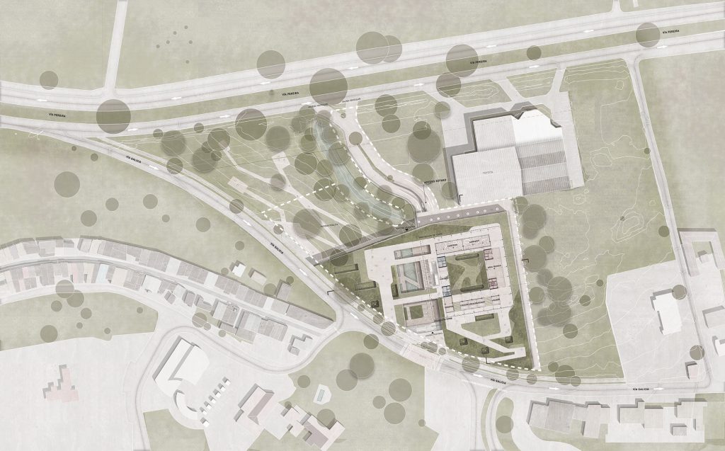 La implantación parte del entendimiento de la topografía y del paisaje del Eje Cafetero. A nivel peatonal se plantea un parque público que articula el acceso al hospital con jardines terapéuticos y recorridos de contemplación. Un sistema de agua recoge y canaliza las lluvias hacia una quebrada cercana, conectando el edificio con el territorio y reforzando la experiencia sensorial del conjunto. Patios vegetados perforan la plataforma principal, permitiendo iluminación y ventilación natural en los espacios interiores.