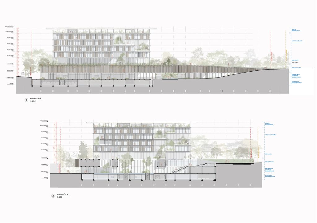 El edificio se organiza como un sistema claro y eficiente. Los programas de mayor intensidad operativa se ubican en los niveles inferiores, optimizando su funcionamiento. La estructura programática se divide en tres grandes grupos: procesos y tratamientos, hospitalización y atención ambulatoria. Esta distribución garantiza claridad en los flujos, eficiencia operativa y una experiencia comprensible para el usuario.