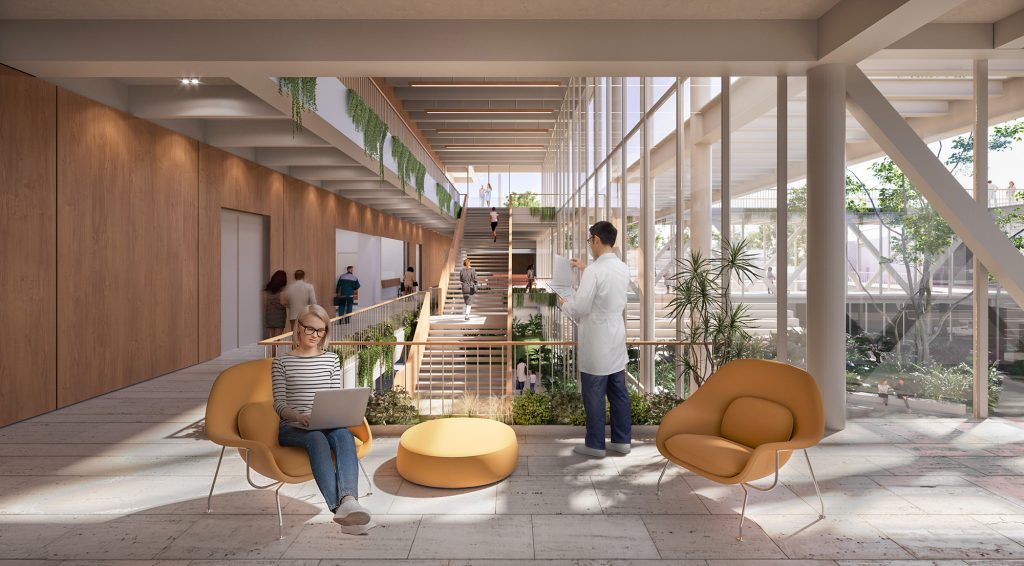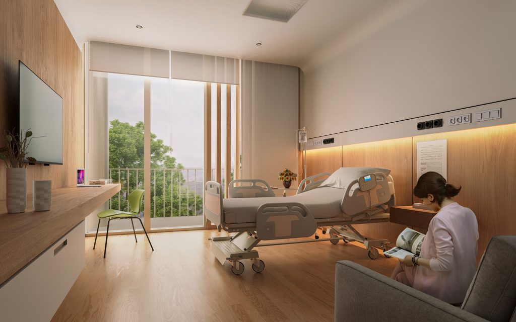 Arquitectónicamente, el hospital busca equilibrar tecnología y cercanía. Se reinterpretan elementos propios de la arquitectura del paisaje cafetero —patio central, balcones y presencia activa de la vegetación— para generar una relación constante entre interior y exterior. El clima tropical andino permite que los espacios se abran hacia el entorno, reduciendo la sensación de encierro tradicional en este tipo de edificaciones.